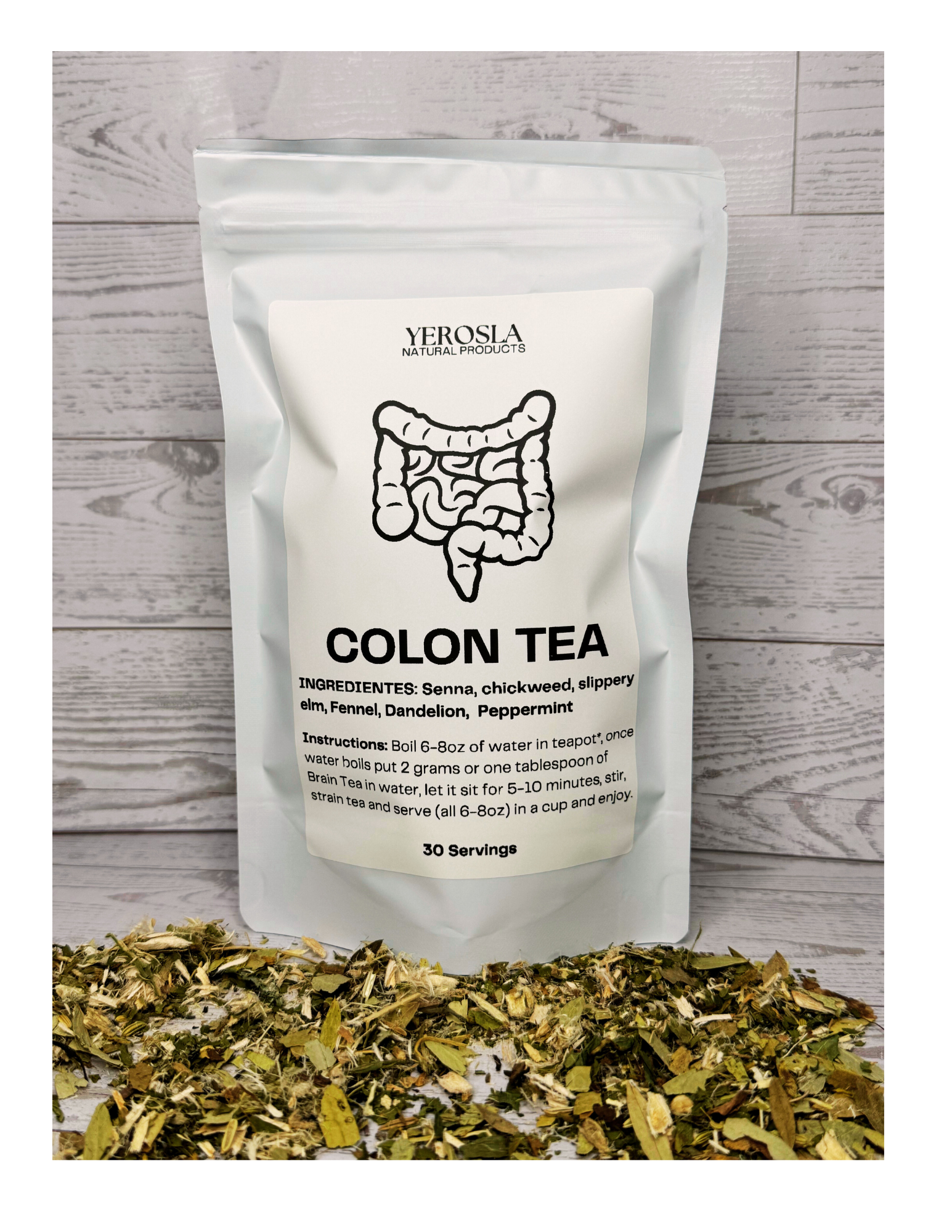 Ingredientes 100% Orgánicos: Senna Alexandrina (Sen), Ulmus rubra (Olmo Resbaladizo), Althaea officinalis (Raíz de Malvavisco), Foeniculum vulgare (Hinojo), Mentha × piperita (Menta), (Hoja de diente de león) 2.5 oz de hierbas. Aproximadamente 30 tazas usando 1 cucharadita por 8 oz de agua.